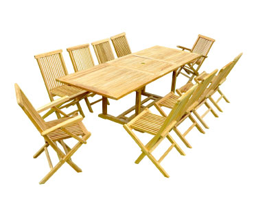 Le teck est un matériau de choix pour les salons à manger d'extérieur. Une huile (l’oléorésine), naturellement contenue dans le bois lui permet de bien résister à l'eau et à la pluie. C'est un bois de nature imputrescible et facile d'entretien.